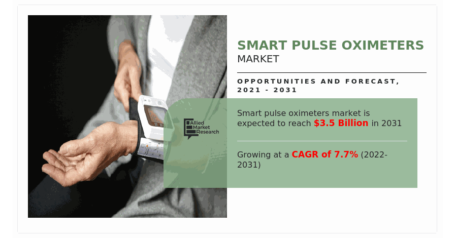 PORTLAND, OREGON, UNITED STATES, October 28, 2023 /EINPresswire.com/ — The Smart Pulse Oximeters Market is experiencing remarkable growth, driven by the increasing focus on remote patient monitoring and the broader adoption of telehealth services. These innovative oximeters, equipped with wireless connectivity and real-time data sharing capabilities, enable healthcare providers to monitor patients’ vital signs from a distance. The COVID-19 pandemic has further accelerated the market’s expansion, as consumers prioritize health monitoring, making smart pulse oximeters a valuable tool in the era of telemedicine. According to a new report published by Allied Market Research, titled, “Smart Pulse Oximeters Market,” The smart pulse oximeters market size was $1.6 billion in 2021, and is estimated to reach $3.5 billion by 2031, growing at a CAGR of 7.7% from 2022 to 2031.