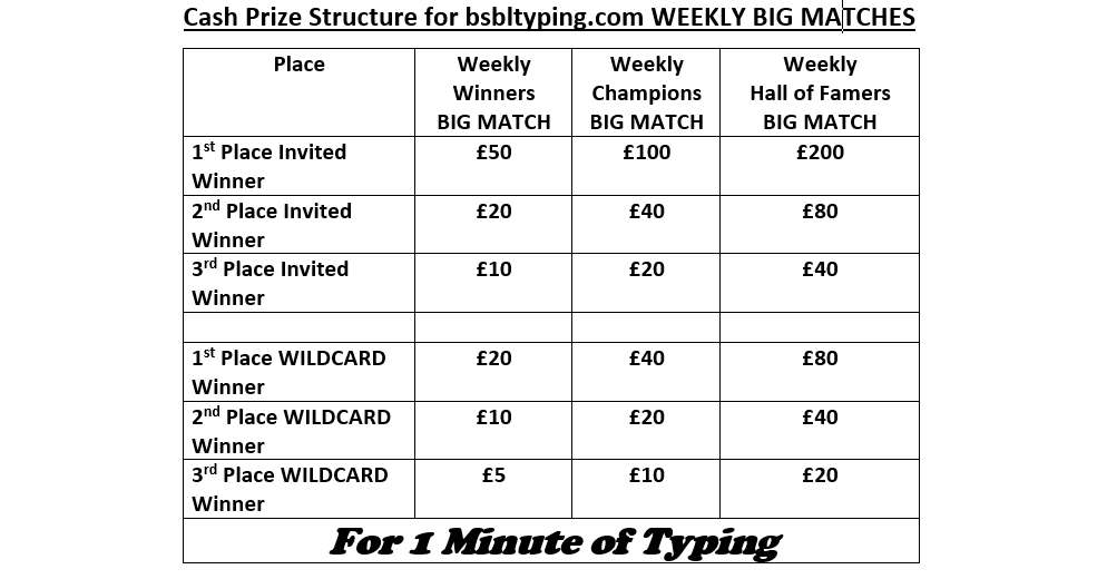 For every of the three common money prize velocity typing competitions – £5 Daily, £10 Weekly and £30 Monthly – bsbltyping have a league desk system of Winners, Champions and Hall of Famers. In Daily and Weekly competitions it takes 4 wins inside a ten week interval to turn out to be a Champion, and then, after a compulsory 4 week break, it takes two additional wins inside a ten week interval to turn out to be a Hall of Famer. In Monthly competitions it’s an identical precept however right here it’s two wins in a ten month interval to turn out to be a Champion after which, after a one month break, one additional win to turn out to be a Famer. Once a competitor turns into a Famer they will now not participate in that particular money prize competitors. All Winners, Champions and Famers are entitled to an invite to every Big Match for which they qualify and every at present receives a money or Amazon Gift Card Support Appreciation Payment for actively collaborating in a Big Match.