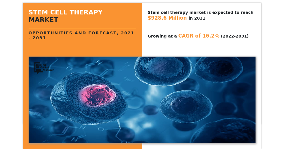 PORTLAND, OR, UNITED STATES, May 9, 2023 /EINPresswire.com/ — The global stem cell therapy market was valued at $205.1 million in 2021, and is projected to reach $928.6 million by 2031, growing at a CAGR of 16.2% from 2022 to 2031.