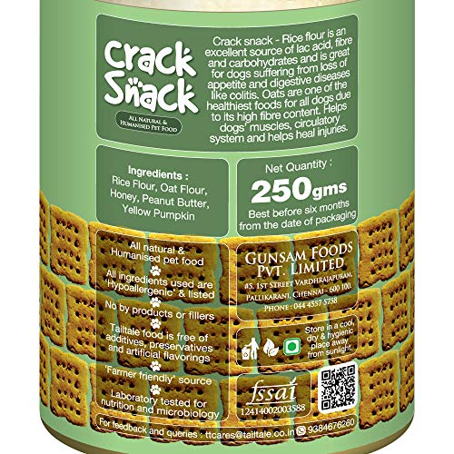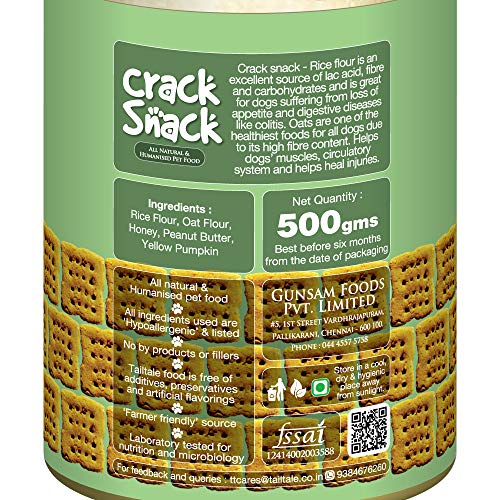 Crack Snack – Rice flour is an excellent source of lac acid, fibre and carbohydrates and is great for dogs suffering from loss of appetite and digestive diseases like colitis. Oats are one of the healthiest foods for all dogs due to its high fibre content. Helps dogs’ muscles, circulatory system and helps heal injuries. Perfect for trainings, play, snacking and treat toys. All ingredients used are Hypoallergenic & listed and procured from farmer friendly sources.