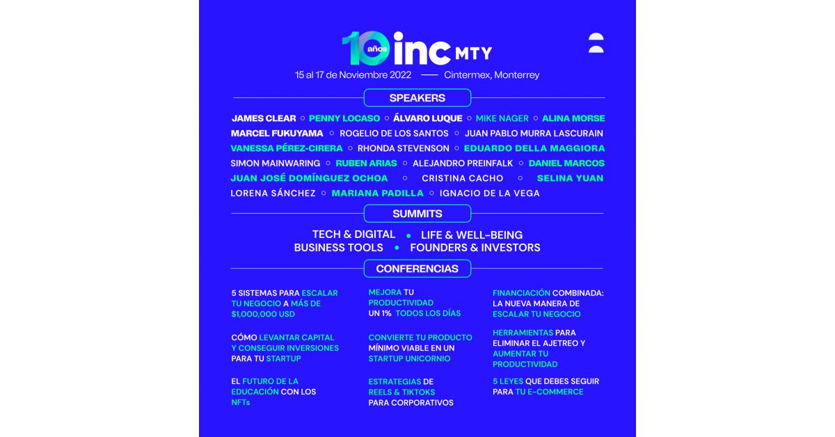 Este summit será parte de las temáticas que serán abordadas en el competition de INCmty del 15 al 17 de noviembre y donde se festejará los 10 años de ser parte del ecosistema emprendedor de la región. Los ejes que guiarán la conversación serán XR, Blockchain, Web 3.0, Fintech Gaming y Entretenimiento y, por último, Transformación Digital.