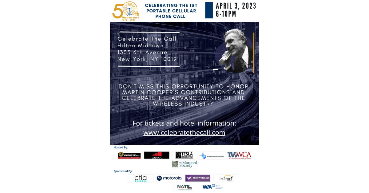 Hosted on April 3, 2023, at the Hilton Hotel Midtown NYC, the evening reception event and dinner will recognize the inventors and the visionary companies and hear predictions for the future of cellular services. Celebratory activities will also include an unveiling of a sidewalk historic marker, steps from the Hilton, and where the first public demonstration of the first portable cell call occurred.