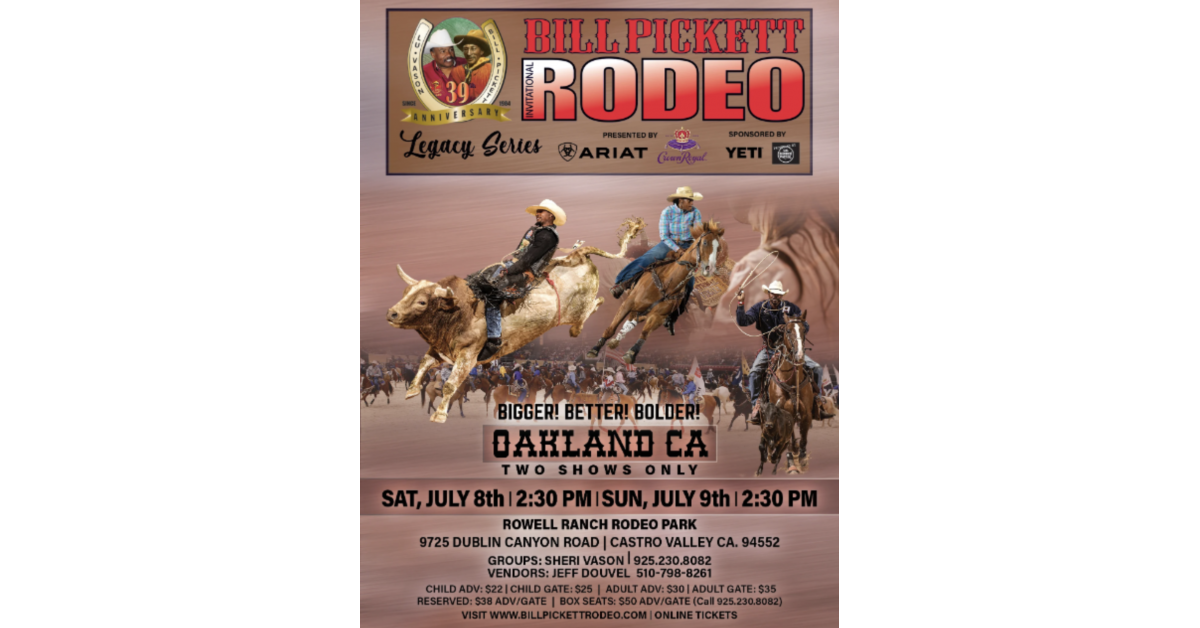 The Oakland, CA. BPIR takes place Saturday, July 8th, 2023, and Sunday, July 9th, 2023 at Rowell Ranch Rodeo Park located at 9725 Dublin Canyon Road, Castro Valley, CA 94552. Doors open both days at 2:30pm. Tickets range from $22 to $38 and can be purchased online at https://www.billpickettrodeo.com/index.php/schedule/oakland-ca. For box seats call 925-230-8032.