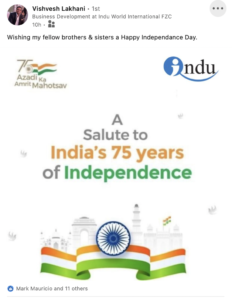 Dubai-based Vishvesh Lakhani, Managing Partner of Indu World International, the duty free operator and liquor consolidator for the Middle East and East Africa, expressed his best wishes for Independence Day in a LinkedIn post.