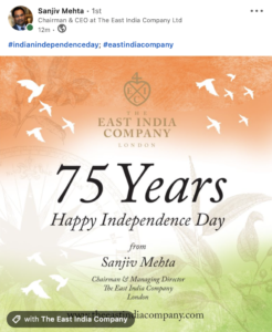 London-based Sanjiv Mehta, Chairman & CEO of The East India Company, the fine foods specialist which is active in travel retail, also took to LinkedIn to mark Independence Day.