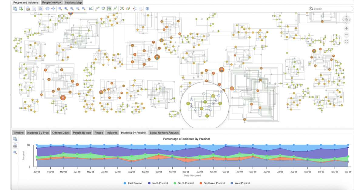 The magnifier tool shows a car theft ring which is part of a larger crime network.