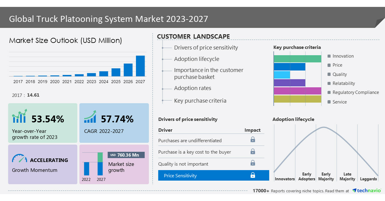 NEW YORK, Aug. 29, 2023 /PRNewswire/ — The truck platooning system market size is estimated to grow at a CAGR of 57.74% between 2022 and 2027. The market size is forecast to increase by USD 760.36 million according to Technavio’s latest market research report estimates. The increasing need to reduce operating costs and fuel computations by the fleet is the key factor driving the growth of the market. This system allows trucks to run closer together in platoons, reducing air drag. This reduces fuel consumption and lowers the rate of emissions. These systems increase efficiency, allowing more goods to be transported and delivered faster. In addition, truck platooning systems reduce human error by automating the driving process, resulting in safer and more reliable operations. Therefore, truck platooning systems play an important role in reducing the number of highway accidents and thereby improving overall traffic safety. Hence, these factors are expected to propel the growth of the market during the forecast period. Technavio offers in-depth market insights that assist global businesses in obtaining growth opportunities. Read Sample Report