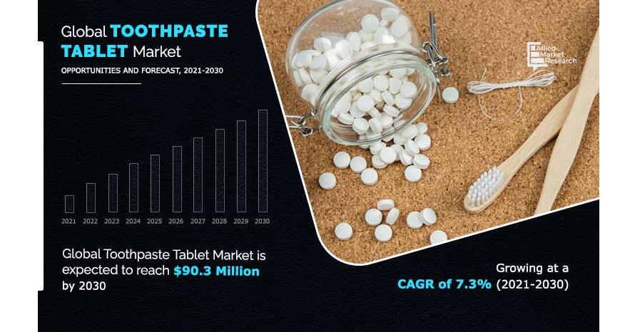 5933 NE WIN SIVERS DRIVE, PORTLAND, OR, UNITED STATES, July 7, 2023/EINPresswire.com/ — According to a new report published by Allied Market Research, titled, “Toothpaste Tablet Market by Product Type, Flavor Type, Packaging Type, Distribution Channel, and Price Point: Global Opportunity Analysis and Industry Forecast, 2021-2030. The report provides a detailed analysis of the top investment pockets, top winning strategies, drivers & opportunities, market size & estimations, competitive landscape, and changing market trends. 𝐓𝐡𝐞 𝐠𝐥𝐨𝐛𝐚𝐥 𝐭𝐨𝐨𝐭𝐡𝐩𝐚𝐬𝐭𝐞 𝐭𝐚𝐛𝐥𝐞𝐭 𝐦𝐚𝐫𝐤𝐞𝐭 𝐬𝐢𝐳𝐞 𝐰𝐚𝐬 𝐯𝐚𝐥𝐮𝐞𝐝 𝐚𝐭 $𝟒𝟓.𝟔 𝐦𝐢𝐥𝐥𝐢𝐨𝐧 𝐢𝐧 𝟐𝟎𝟐𝟎, 𝐚𝐧𝐝 𝐢𝐬 𝐩𝐫𝐨𝐣𝐞𝐜𝐭𝐞𝐝 𝐭𝐨 𝐫𝐞𝐚𝐜𝐡 $𝟗𝟎.𝟑 𝐦𝐢𝐥𝐥𝐢𝐨𝐧 𝐛𝐲 𝟐𝟎𝟑𝟎, 𝐫𝐞𝐠𝐢𝐬𝐭𝐞𝐫𝐢𝐧𝐠 𝐚 𝐂𝐀𝐆𝐑 𝐨𝐟 𝟕.𝟑% 𝐟𝐫𝐨𝐦 𝟐𝟎𝟐𝟏 𝐭𝐨 𝟐𝟎𝟑𝟎.