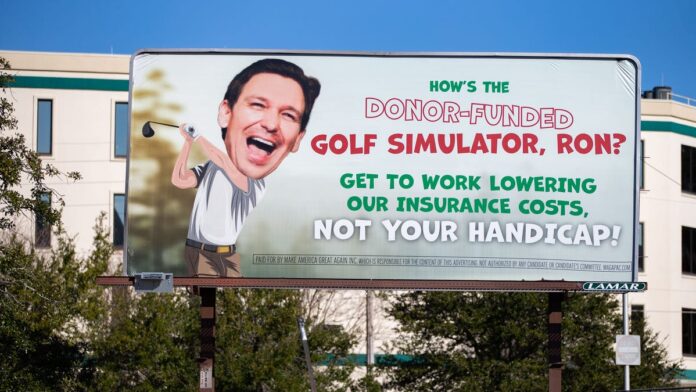 Another features a cartoonish DeSantis swinging a golf club and advises, “Get to work lowering our insurance costs, not your handicap!” That’s a swipe at “a golf simulator that reportedly was given to the governor’s mansion by a wealthy political donor with close ties to the Republican governor,” CNN reported.
