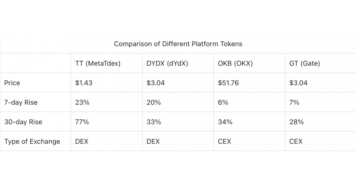 TORONTO, DUBAI, UNITED ARAB EMIRATES, March 2, 2023 /EINPresswire.com/ — According to CoinmarketCap, platform token is one of the most obvious conceptual sectors in the recent crypto market uptrend. TT ($1.43) and DYDX ($3.04) are two leading platform tokens with the highest weekly gains of 20%. Besides, at the end of February, most platform token prices also hit new highs in 2023. Led by the high rise of platform tokens, the price of mainstream tokens such as BTC and ETH kept steady amid volatility as well and ushered in a monthly increase of 3%. The spring of the crypto market seems to be on the way.