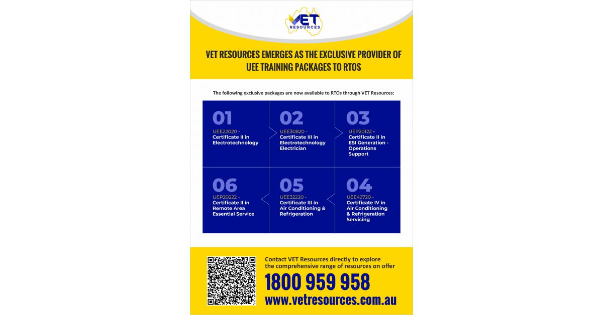 DEER PARK, VIC, AUSTRALIA, October 9, 2023 /EINPresswire.com/ — VET Resources, a renowned leader in the vocational education and training sector, is delighted to announce its exclusive offering of the comprehensive UEE Training Package to Registered Training Organisations (RTOs) nationwide. VET Resources is the sole resource provider currently providing RTOs with access to a range of specialised packages designed to meet the demands of the fast-evolving electrotechnology and essential services industries.
