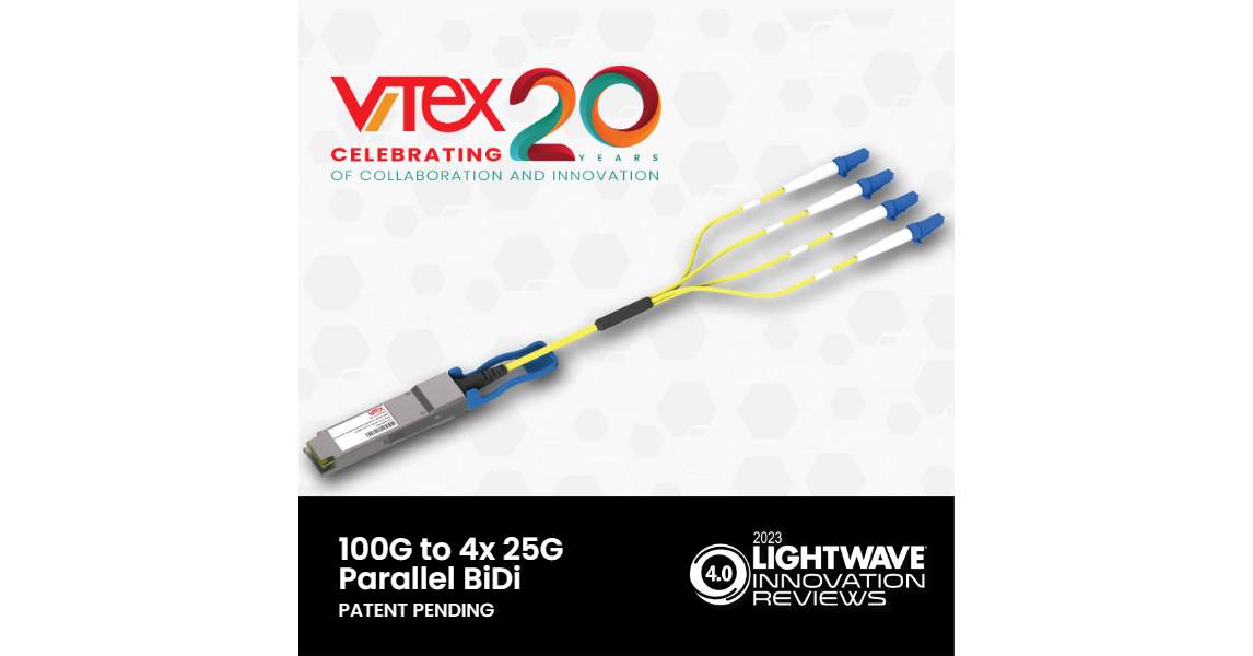 “As a specialized developer and supplier of fiber optic connectors for twenty years, I was thrilled when the Vitex 100G BiDi breakout AOC was recognized as unique with a prestigious Lightwave award. The excitement has only multiplied with our very first patent-pending notification,” says Michael Ko, Managing Director at Vitex. “Our mission and interest are solving communication problems. In this particular situation, the 100G QSFP28 to 4x 25G parallel bi-directional AOC was developed for the 5G telecommunications market as a singular solution for condensing 4x25G installations into a single 100G QSFP socket. The product’s success is lockstep with our commitment to solving engineering problems with creativity and innovation.”