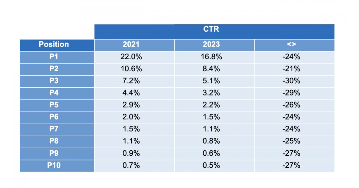 Indago’s dataset shows that there’s been an average drop in CTR of 26% across all ten positions on page one of Google Australia.