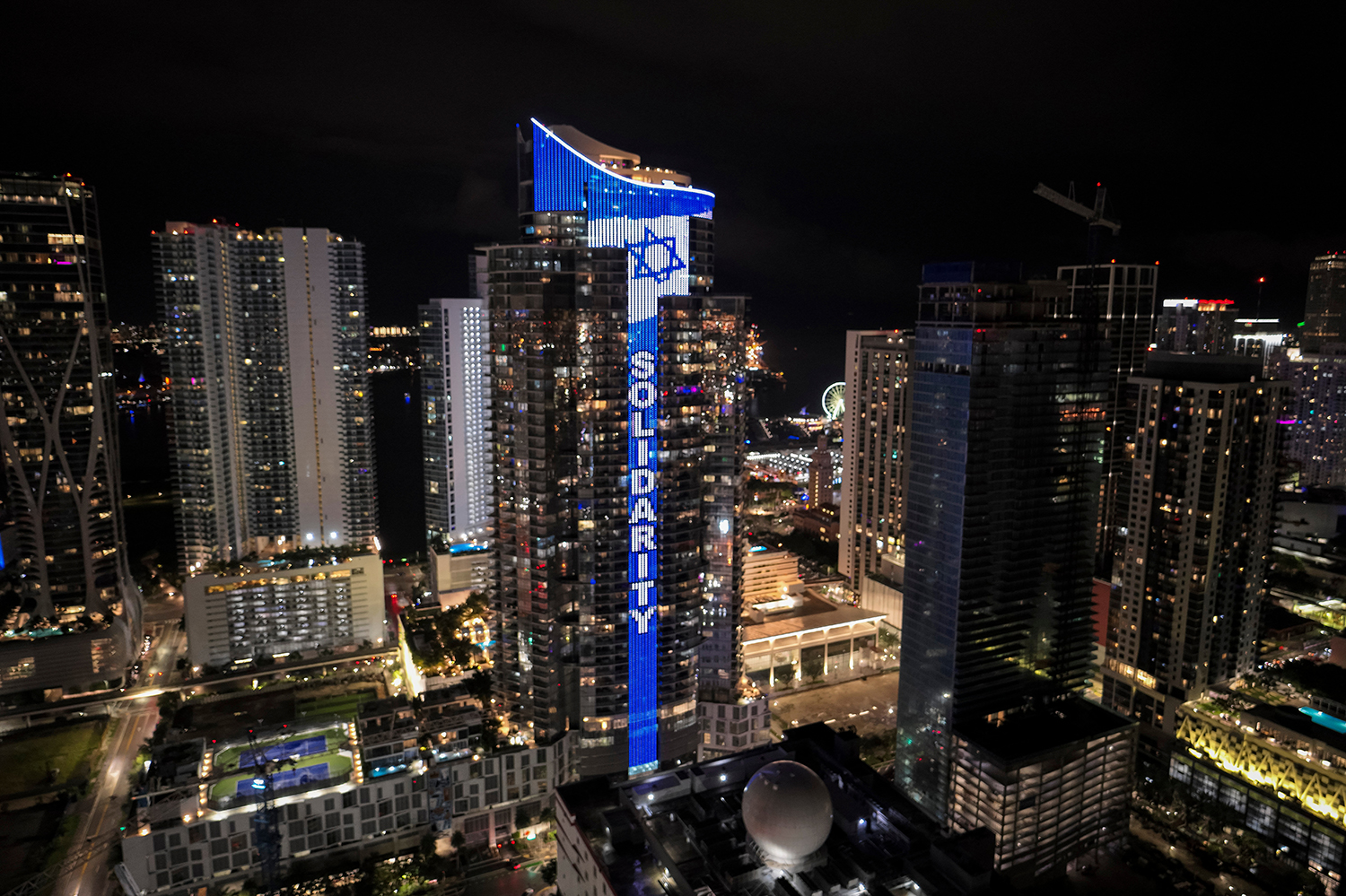 MIAMI, Oct. 09, 2023 (GLOBE NEWSWIRE) — The World’s Tallest Digital Israeli Flag and the enormous electronic word, “solidarity,” spelled in English and Hebrew, are lighting-up the 60-story Paramount Miami Worldcenter skyscraper in downtown Miami.