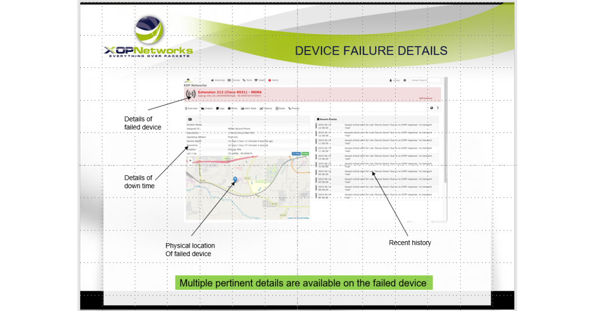 • Drill-down feature: Click on any device to view the device’s details, downtime details and history of events associated with the device.
